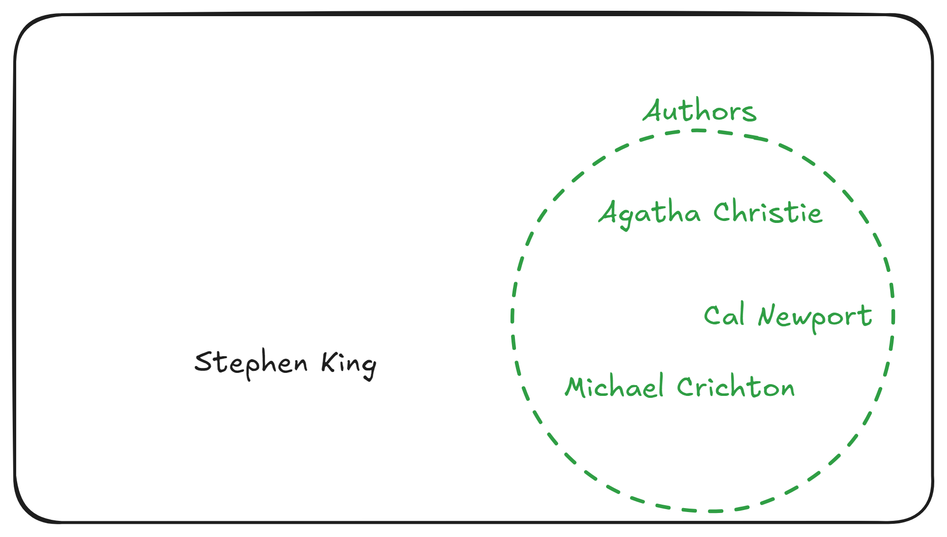 Here, we are saying set contains objects, namely: Agatha Christie, Cal Newport, Michael Crichton.