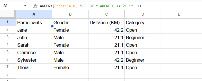 Let’s say we need to find out how which people are running 21.1KM or more because they need to start earlier compared to the 10KM runners. How should we do this? You’d use something like this formula: