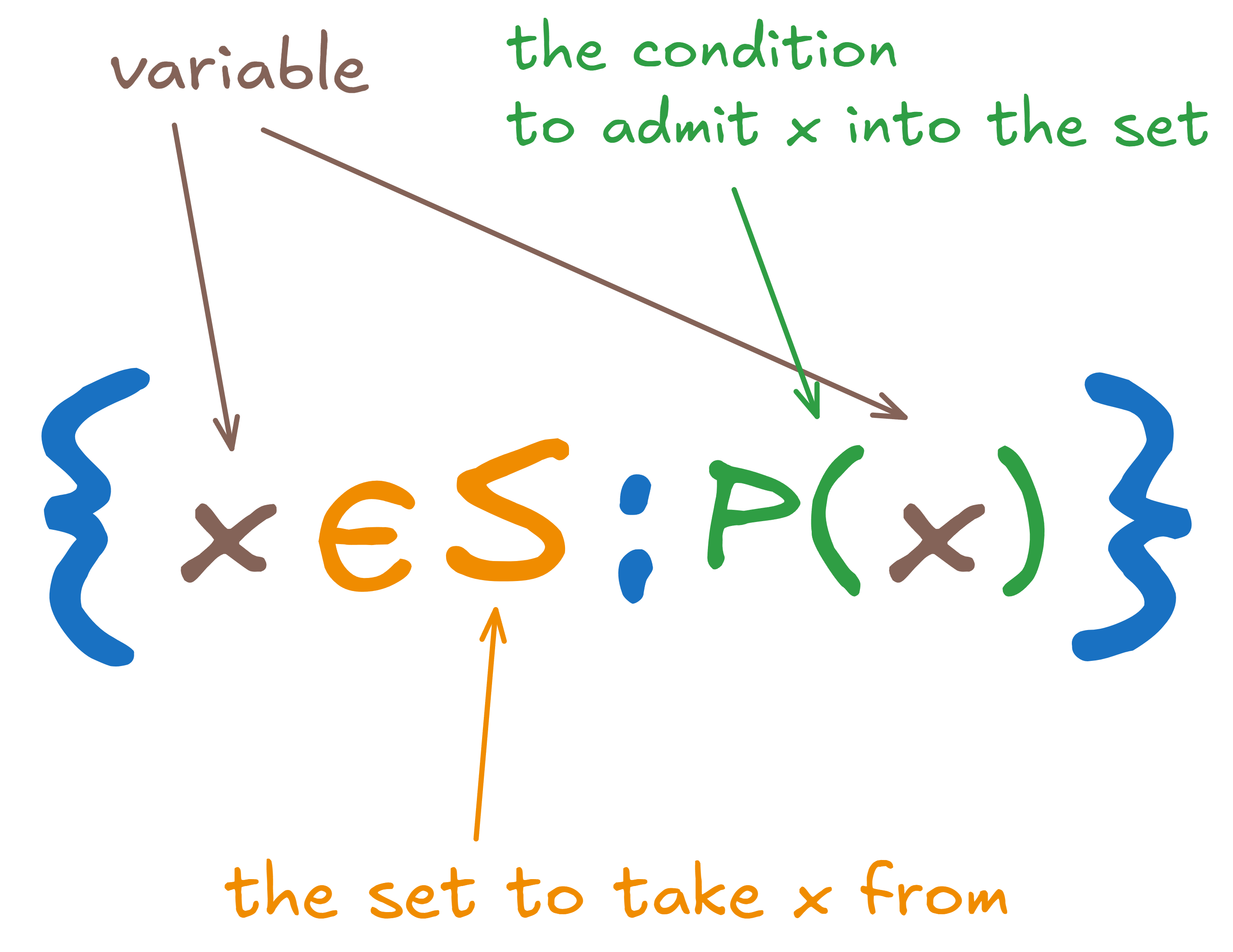 You might have noticed that the set operations we are doing bear some similarity to the logical operations. For example, a set intersection () operation really does look a little bit like the logical and () operation. After all, if , then contains all elements such that . Similarly, if , then contains all elements such that .