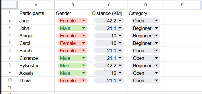 Let’s see some of the concepts in action. Let’s say that we are some marathon event organiser, and we had an initial Google sheet that kept the data of the participants. For each participant, we keep their name, their gender, the marathon distance they have signed up for, and whether they signed up as a beginner, or are in the open category.