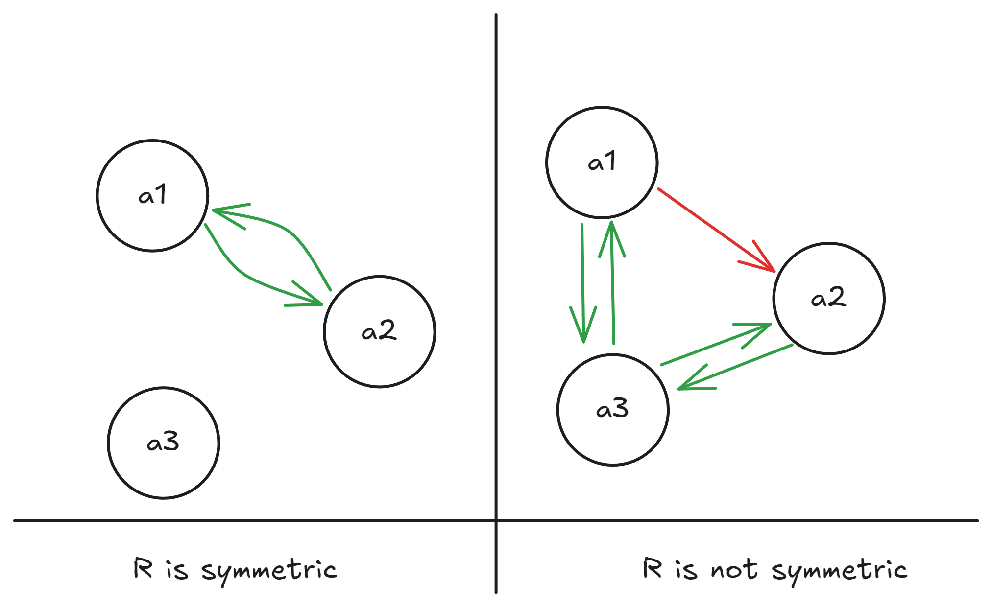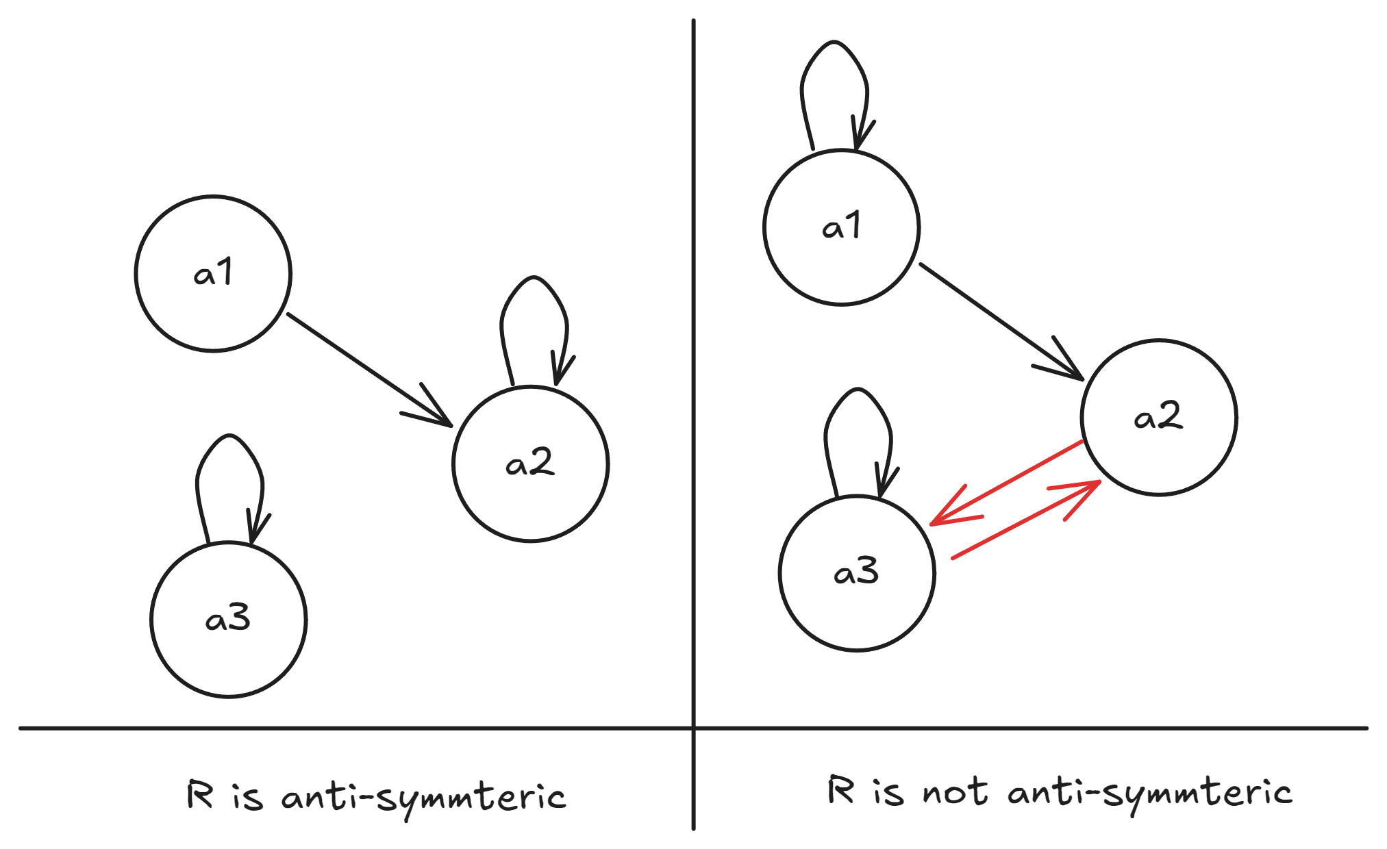 A relation on the left is anti-symmetric because the only time and are related are either: when , or when the relation is “one-sided”. Like is related to but not the other way around.