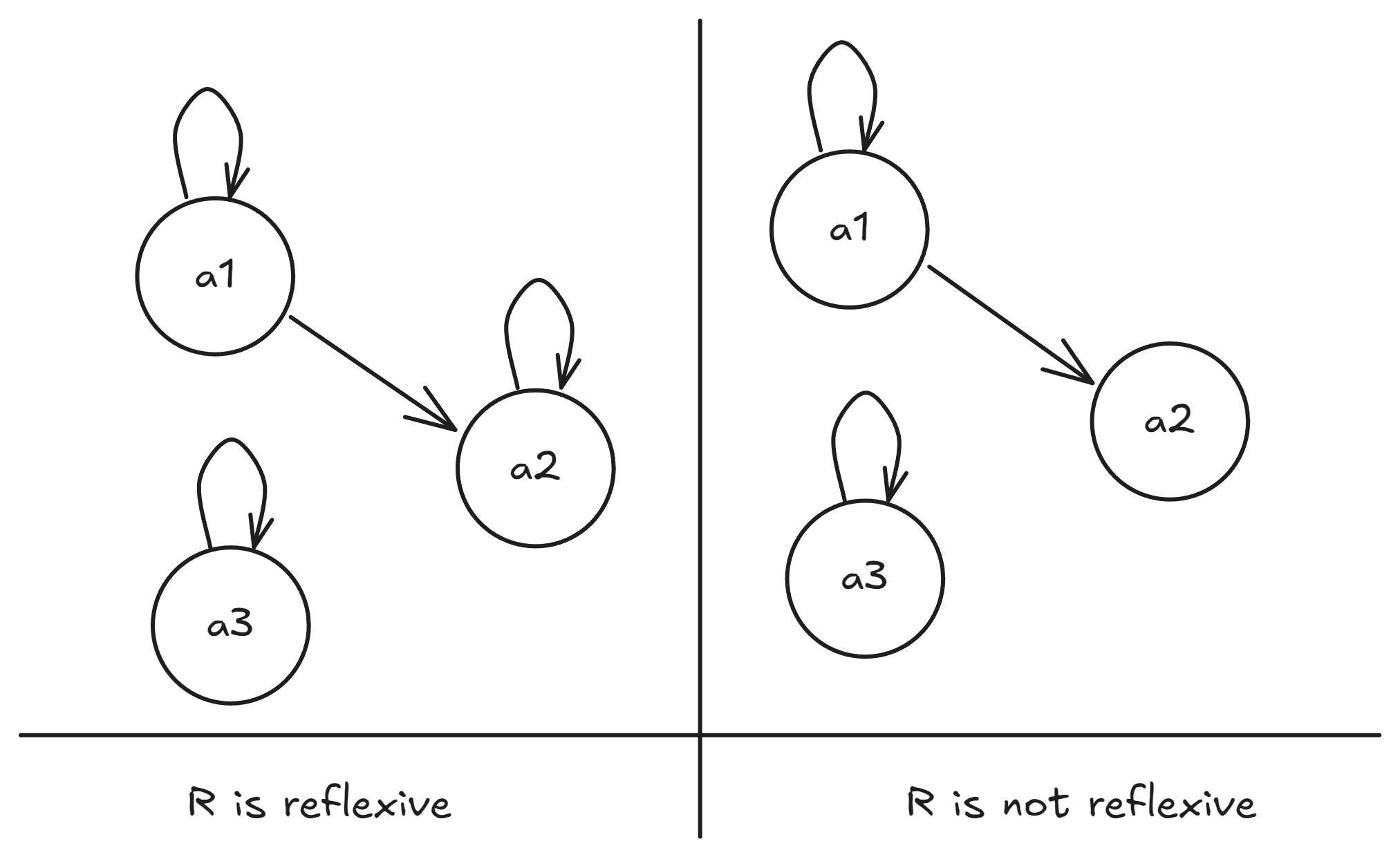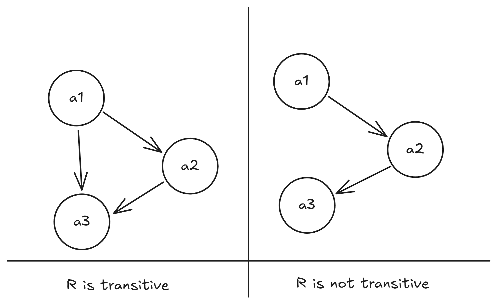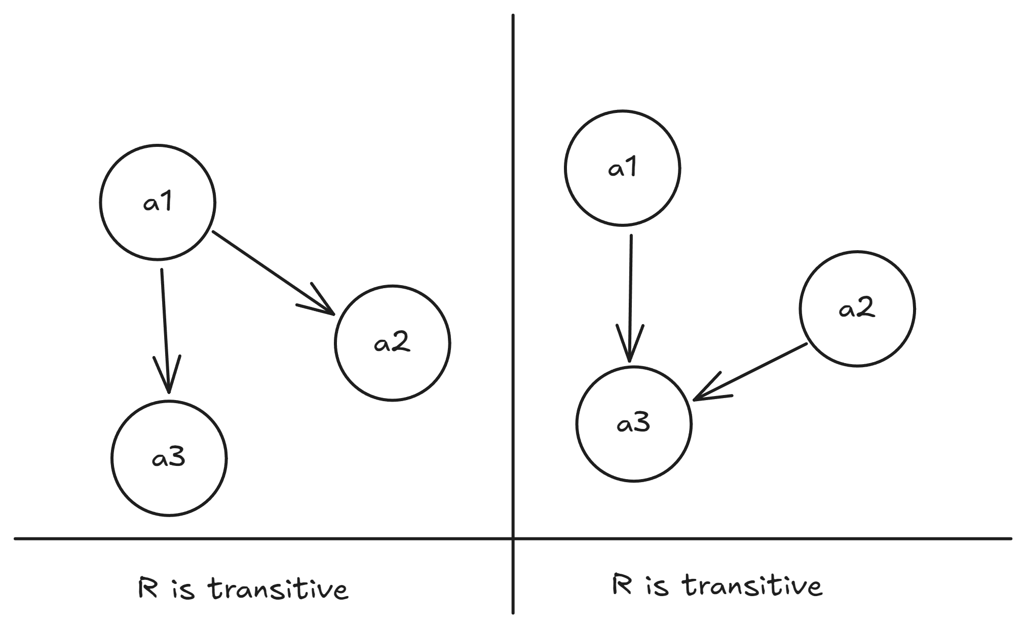 Pictorially, because both and are related, we must have that are related too. On the other hand, in the right side, both and are related, but are not related, so the relation on the right hand side is not transitive.